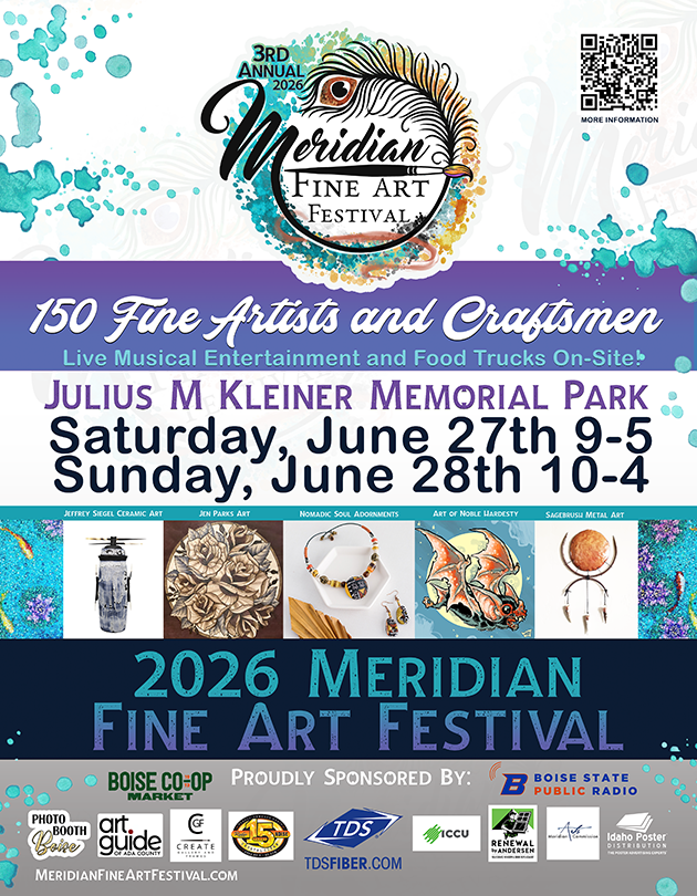 Join us June 27th and 28th, 2026 at Kleiner Park in Meridian, Idaho for the 3rd Annual Meridian Fine Art Festival. We will be featuring 125 artists and craftsmen from the Pacific Northwest with everything from painting to leatherwork, wood burning to stained glass, as well as handcrafted jewelry. Shop till you drop at the 3rd Annual Meridian Fine Art Festival! This is an outdoor, juried, fine art fair, conveniently located near the Village in Meridian. The park is complete with a playground and splash pad for the kids. Enjoy live entertainment by Matt Roos and Friends, as well as a performance by Raks Al Dunia (Sunday only). Mouth watering food vendors will be on site – plus – Designed for You Face Painting will be available for the kiddos and Photo Booth Boise will be taking free keepsake photos!
